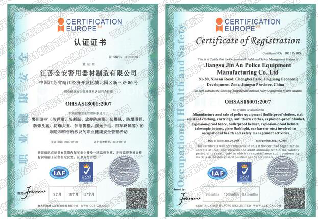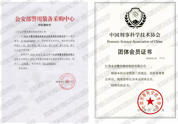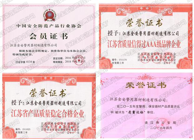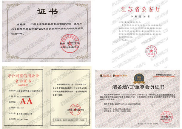 第一批新型單警裝備定點(diǎn)生產(chǎn)企業(yè) 公安部警用裝備采購(gòu)中心協(xié)議供貨單位 公安部防彈防刺服生產(chǎn)定點(diǎn)企業(yè) 江蘇省公安廳防彈衣入圍企業(yè) 江蘇警用裝備行業(yè)協(xié)會(huì)會(huì)員單位 中國(guó)刑事科學(xué)技術(shù)協(xié)會(huì)團(tuán)隊(duì)會(huì)員單位 中國(guó)安全防范產(chǎn)品行業(yè)協(xié)會(huì)會(huì)員單位 靖江市保安器材行業(yè)協(xié)會(huì)常務(wù)理事單位 全國(guó)警用裝備標(biāo)準(zhǔn)化技術(shù)委員會(huì)通訊委員 江蘇金安警用器材制造有限公司始創(chuàng)于九十年代初,公安部防彈防刺服生產(chǎn)定點(diǎn)企業(yè)、公安部警用裝備采購(gòu)中心2..